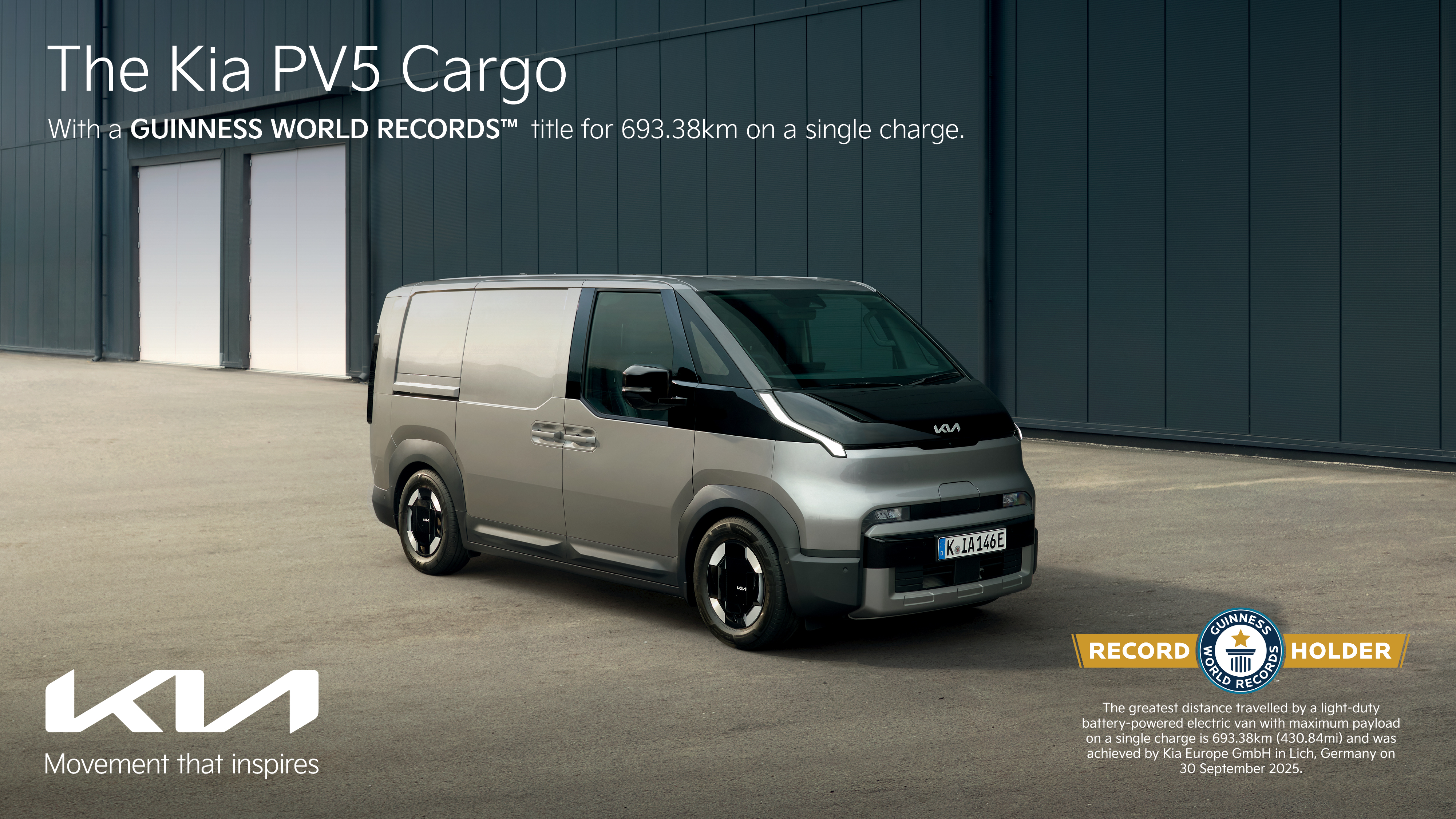 „Kia“ pateko į istoriją, pasiekdama naują pasaulinį vien elektra nuvažiuojamo atstumo rekordą. „Kia PV5 Cargo“ – pirmasis bendrovės specialiai sukurtas elektrinis lengvasis komercinis automobilis (eLCV) iš novatoriškosios „Platform Beyond Vehicle“ (PBV) modelių gamos – oficialiai užfiksavo Gineso pasaulio rekordą, kurio apibūdinimas skamba taip:„Didžiausias atstumas, kurį vienu įkrovimu nuvažiavo lengvojo tipo akumuliatorinis elektrinis furgonas su maksimaliu kroviniu, yra 693,38 km (430,84 mylios).“